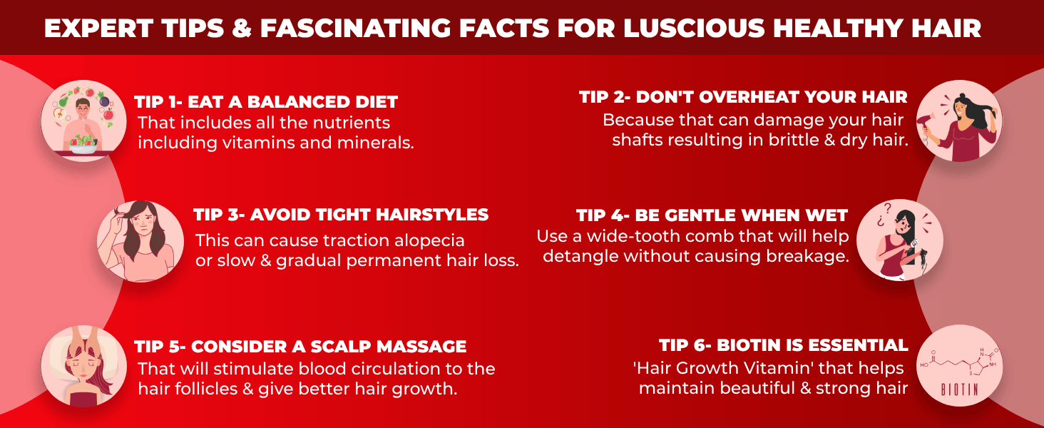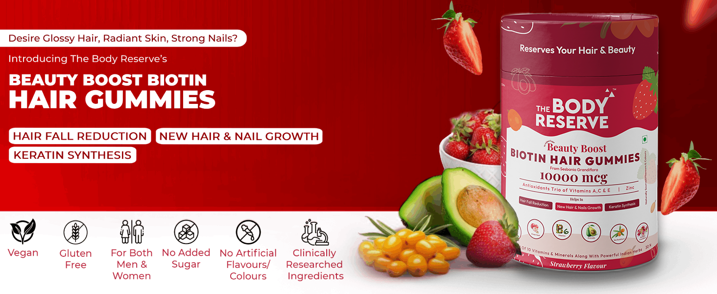 - Promotes Hair Growth and Reduces Hair Fall: Our gummies, loaded with Biotin, Vitamins A, C, E, B6, B9, B12, and D2, are designed to minimize hair fall and stimulate hair growth. Biotin, a vital component for hair tissue repair, nurtures the health of hair follicles and oil glands, thus helps in preventing hair blockage which helps in strong hair.