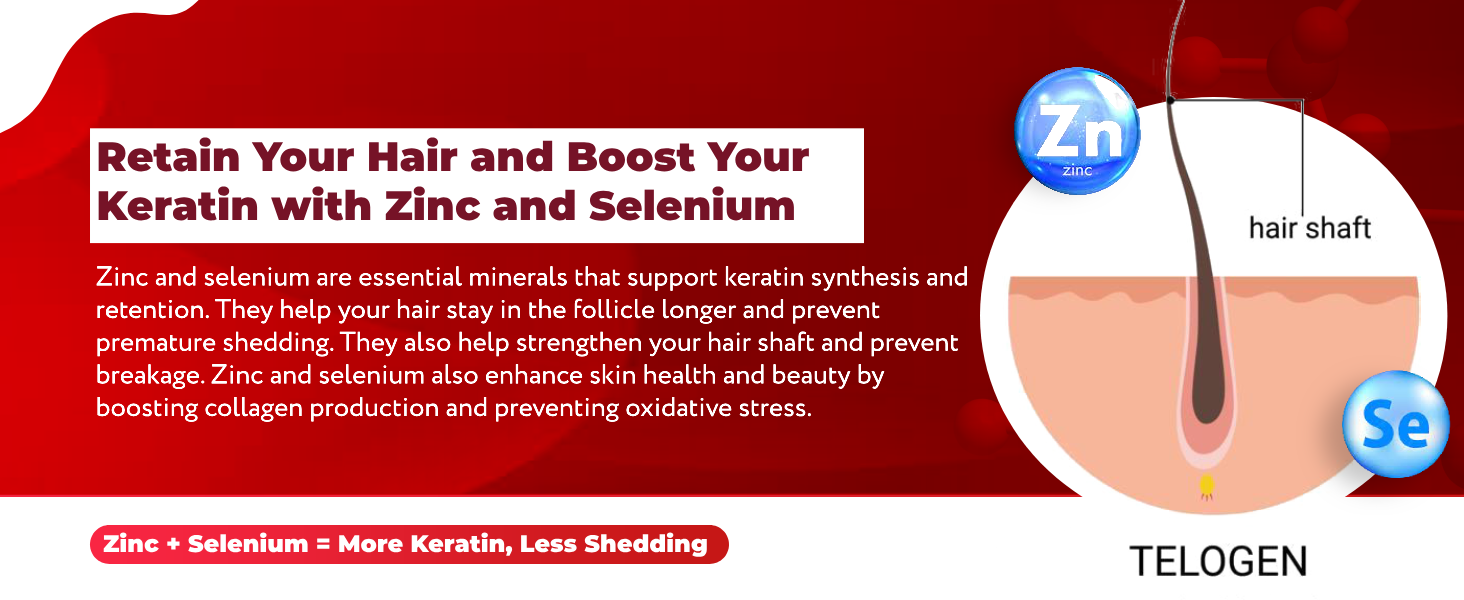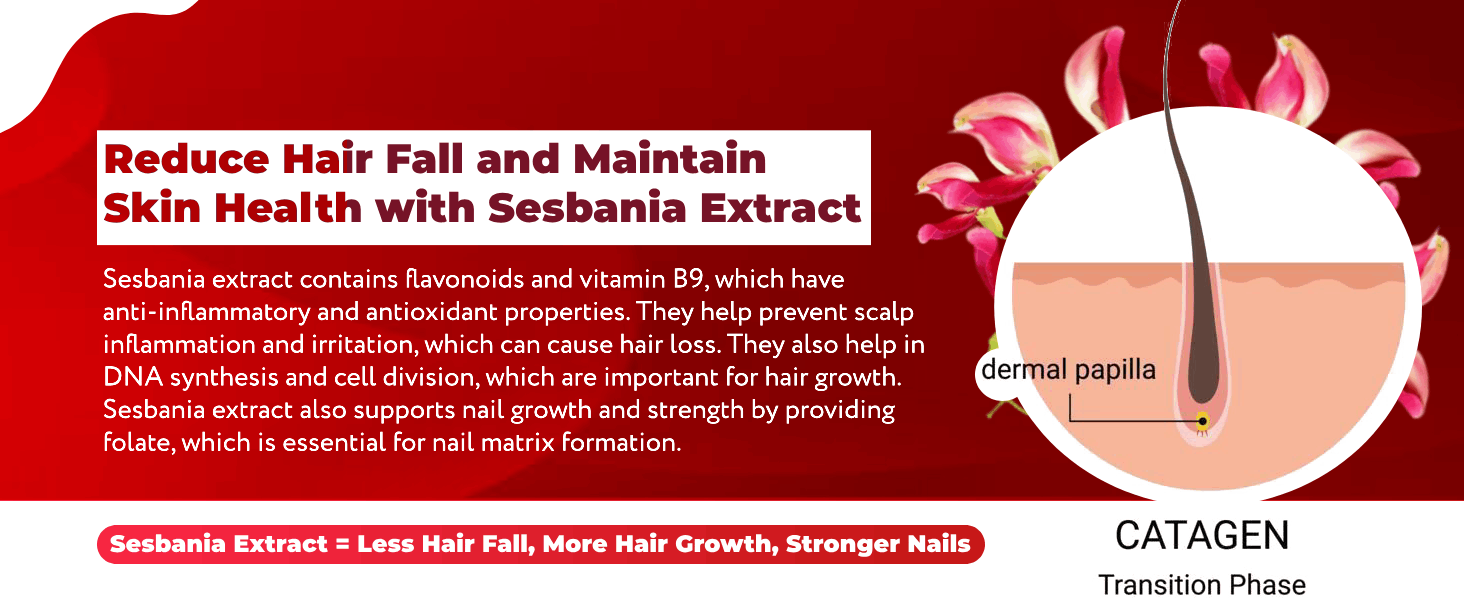 - Nourishes Hair Follicles: Our potent blend of Sesbania Extract, Zinc, and other multivitamins work synergistically to nourish hair follicles. This provision of essential nutrients supports the production of healthier, shinier hair, improving hair strand strength, reducing breakage, and delaying hair aging, and also helps to maintain keratin levels