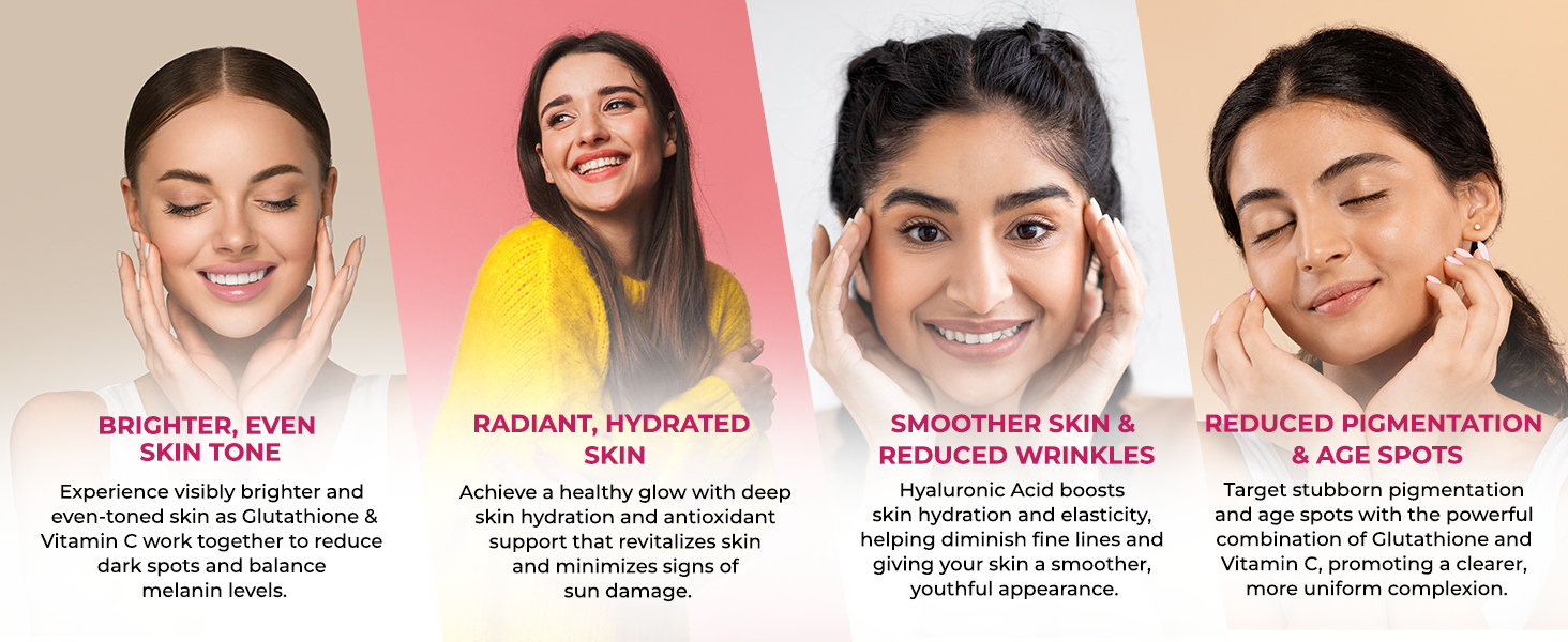- Special Ingredients: Glutathione, Vitamin C & Hyaluronic Acid