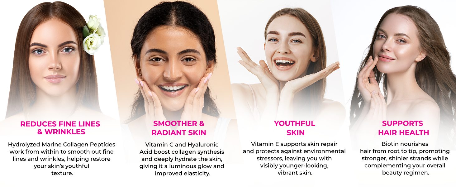 Formulated with premium marine collagen peptides, this supplement helps improve skin elasticity, hydration, and smoothness, contributing to a radiant complexion.