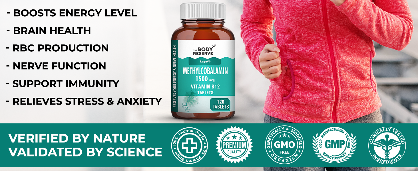 Support your wellness journey with THE BODY RESERVE Methylcobalamin Vitamin B12 1500 mcg Tablets (RiseoVit)—a scientifically formulated B12 supplement designed for maximum absorption and effectiveness.