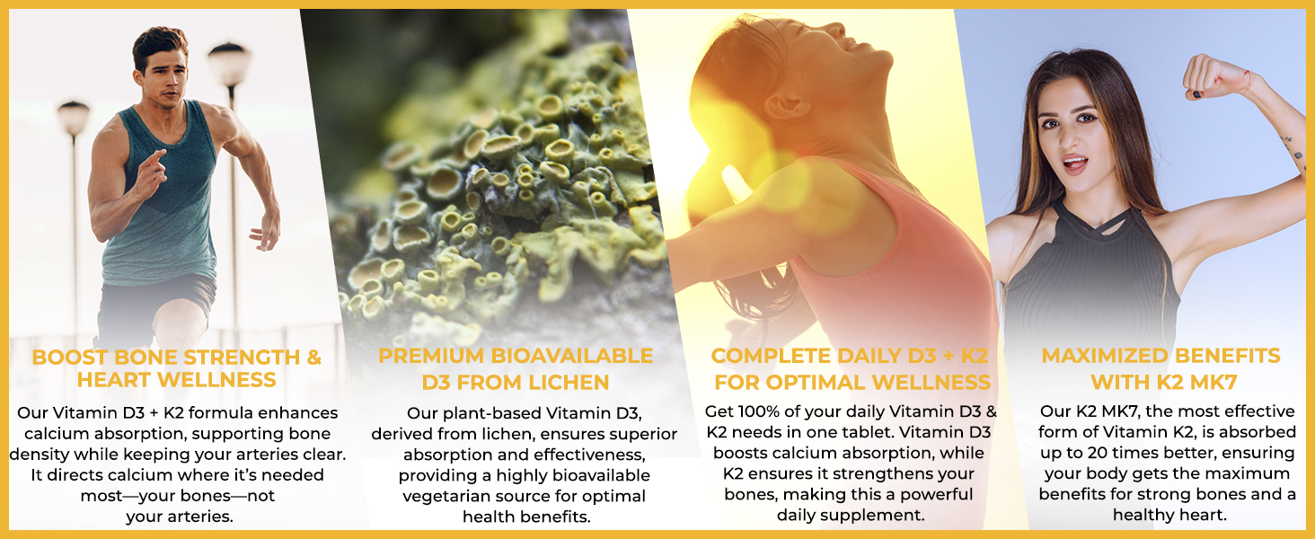 VITAMIN D3 AND K2 SYNERGY: Vitamin D3 promotes better absorption of calcium, and Vitamin K2 ensures proper placement of calcium in your bones and away from the arteries. This potent combination helps build stronger bones and ensures cardiovascular health.
